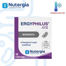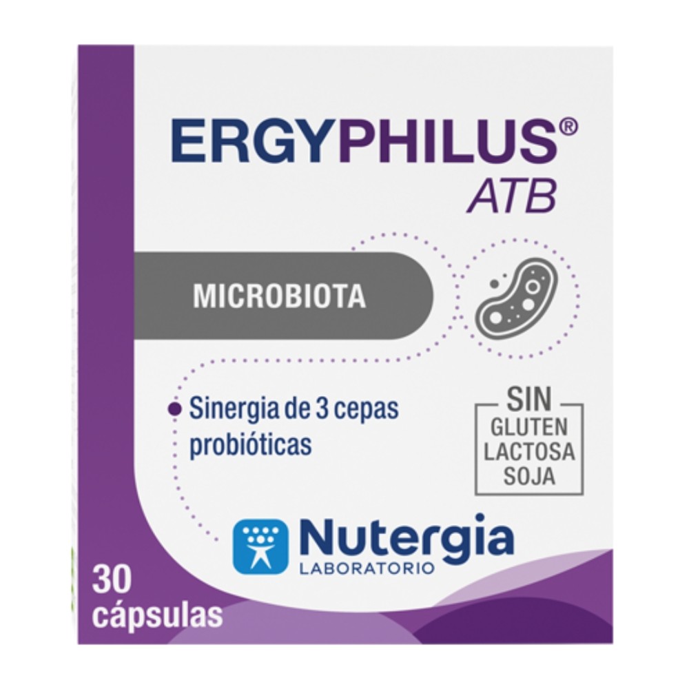 ERGYPHILUS ATB 30 CAP NUTERGIA es una sinergia única de 3 cepas de lactobacilos, rigurosamente seleccionadas por sus propiedades beneficiosas sobre las molestias gastrointestinales debidas a la toma de antibióticos.