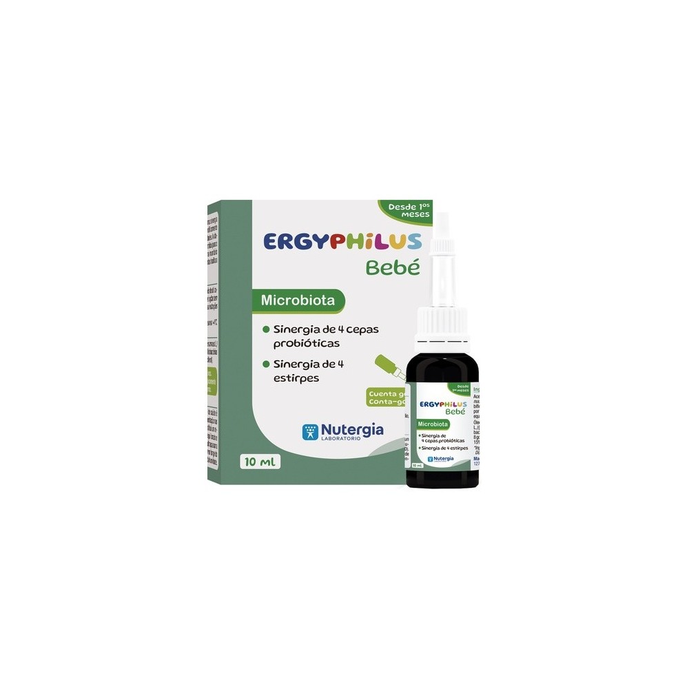ERGYPHILUS BEBE MICROBIOTA 10 CC NUTERGIA ¿Sabías que los 1.000 primeros días de vida son esenciales? Durante estos días, la alimentación, el modo de vida y los hábitos del recién nacido, juegan un papel determinante en la salud presente y futura. ERGYPHILUS Bebe favorece el equilibrio de la flora intestinal infantil desde el nacimiento gracias a la sinergia única de 4 cepas probióticas (bifidobacterias y lactobacilos) La vitamina D3 completa esta fórmula y contribuye al funcionamiento normal del sistema inmunitario de los niños.